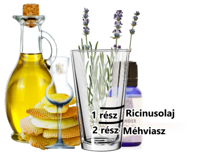 Első lépés, végy két rész méhviaszt, egy rész ricinusolajat, 1 üvegpoharat(hőálló legyen) és 1 kisebb lábost.