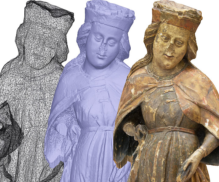 A Mária szobor 3D modelljének létrehozási lépései. Balról jobbra: pontfelhőből készült poligonháló; szilárdtest modell; texturált modell